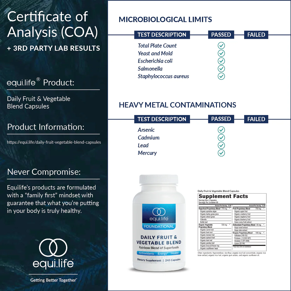 You probably know by now that you should be eating the recommended 7-9 servings of fruits and vegetables every day. The problem is, even if you eat the recommended servings on a daily basis, you're probably not getting the wide variety of colorful vegetables your body needs. The EquiLife Daily Fruit & Vegetable Blend (Capsules) is the fastest and most simple way to ensure you get the benefits of 22 fruits and vegetables, plus antioxidants and rare superfoods that support optimal health with quick and easy capsules.