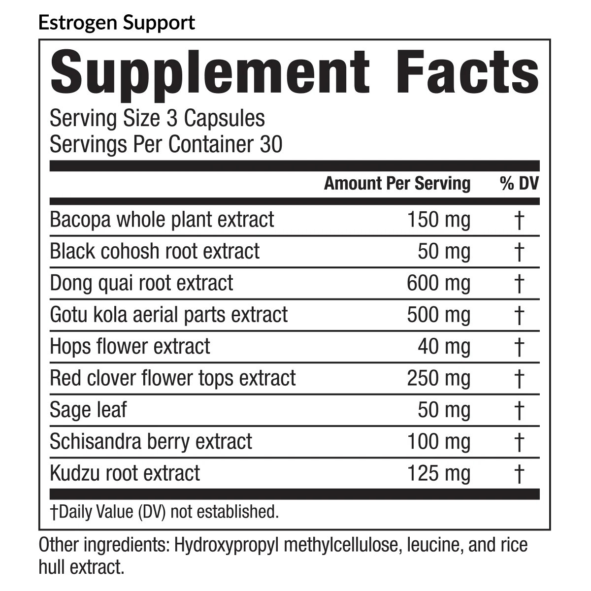 Estrogen is an important regulatory hormone in both men and women. It plays important roles in energy production, mood, concentration, and temperature regulation. In women, estrogen levels drop off dramatically during and after menopause. Estrogen Support uses the power of phytoestrogens, plant produced estrogen, to help increase estrogen levels, balance hormones and boost energy.