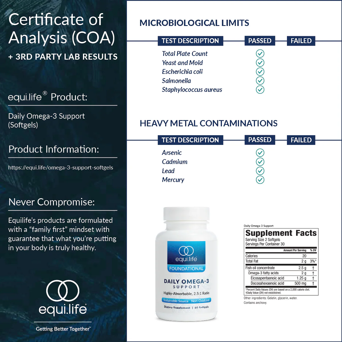 Omega-3 fatty acids are essential for healthy nutrition, yet obtaining high-quality sources through diet alone can be challenging. Omega-3 Support by EquiLife provides 2.5g of sustainably sourced, and superior triglyceride formulated fish oil for enhanced absorption. With Omega-3 Support, modulating inflammation, supporting a healthy heart and brain is not only good for you but also good for the planet.